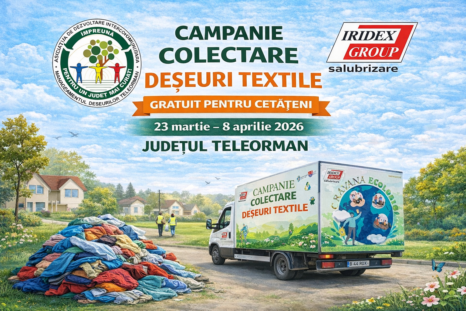 Iridex Group Salubrizare, în parteneriat cu Asociația de Dezvoltare Intercomunitară Managementul Deșeurilor Teleorman (ADI-MDTR) și autoritățile publice locale, derulează în perioada 23 martie – 8 aprilie 2026 o campanie amplă de colectare gratuită a deșeurilor textile, adresată cetățenilor din județul Teleorman.